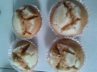 7 、盖着面糊,大概三十分钟后搅一搅。把咖啡面糊均匀的放进纸杯里(七分满),再把一小匙的白面糊放在咖啡面糊上。