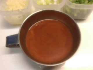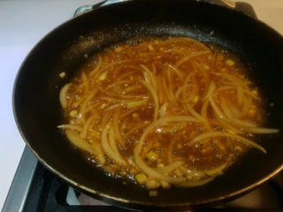 3 、利用剩余锅中的油下蒜末、葱白、洋葱丝爆香,加入调和好的茄汁浆继续翻炒至洋葱丝软化。