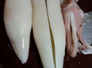 优质鱿鱼体形完整坚实,呈粉红色,有光泽,体表面略现白霜,肉肥厚,半透明,背部不红。