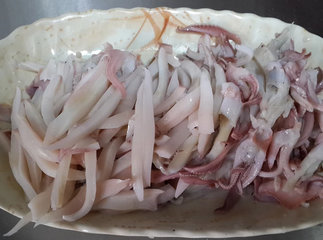 2 、小卷处理好(剥掉外层薄皮、清理内脏)将熟小卷的心抽出并冲洗干净后。
