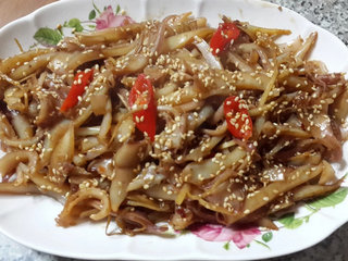 主料:熟小卷500公克,姜丝适量,辣椒一根,白芝麻少许,花椒油一大匙