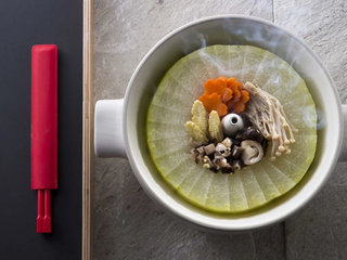 4、烧红镬下葡萄籽油,中火爆香蒜茸,加入(2),淋上调味料及蒸瓜汁煮滚,再加生粉芡煮稠,最后淋上冬瓜即可。
