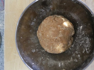 2 、将黑糖水倒入太白粉拌成团。