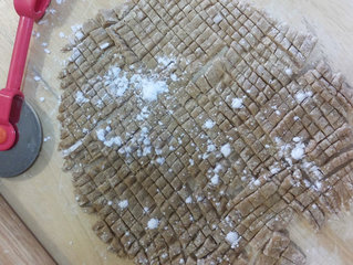 3 、将黑糖团杆成薄片,洒些太白粉,切喜欢大小,小点煮较快,尽量切断。