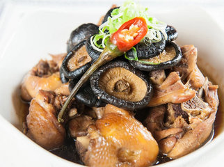 3、另取锅爆香葱、辣椒、姜及干香菇,放入作法2的鸡腿,加入调味料与适量水(含香菇水),烧至鸡腿熟成即可。