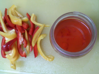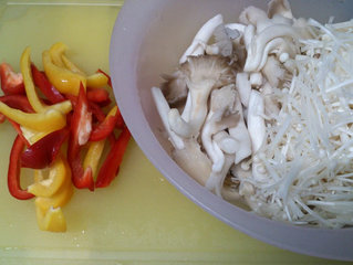 1、干香菇泡水后切丝,菇类洗净, 甜椒切丝备用,金针菇怕过长不易咀嚼,我有对半切段。