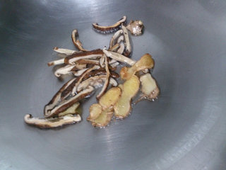 3 、炒锅适量油中火煸姜片, 姜片微卷再放香菇丝一起煸。