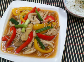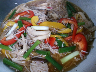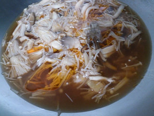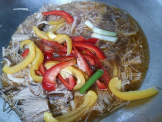 主料:袖珍菇一包,金针菇两包,红黄椒各半颗,干香菇两朵,姜片五片,青葱两支