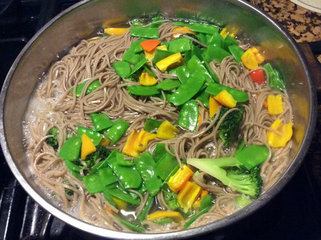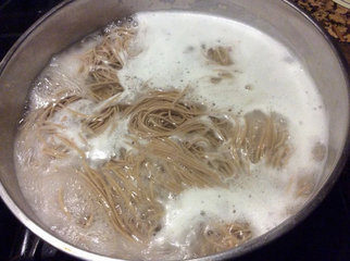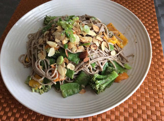 杏仁酱荞麦面,杏仁酱与花生酱有类似的营养成分,但较为不甜,含有稍高的维他命E及矿物质,杏仁可降低胆固醇,荞麦面及蔬菜则提供了纤维质,一道健康营养的简单料理。原食谱是用全麦面,但因家中有许多荞麦面,所以改用荞麦面,营养成分不减分哦。