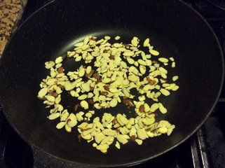 3 、煮面的同时用平底锅干锅煎香杏仁片,或用烤箱烤也行。