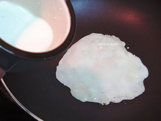 2 、低筋面粉和水和开。平底锅以适量油热锅,面粉水倒入锅中(留一大匙),成圆形,撒上柴鱼粉。
