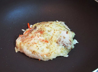 11 、翻面后,表面刷上意面肉酱,撒上海苔粉、青葱,即完成。
