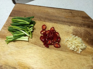 2 、将葱切段、辣椒切小圈、蒜切碎。