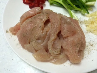 3 、鸡胸肉切成细条状。