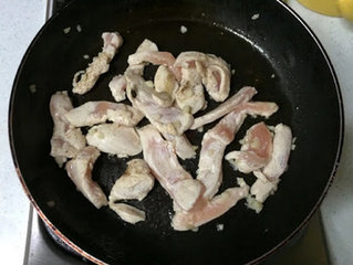 7 、放入鸡胸肉后中火快炒至变色。