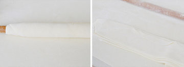 4、将面团擀成一张很大的薄片,撒上干面粉,一层层的折叠起来。