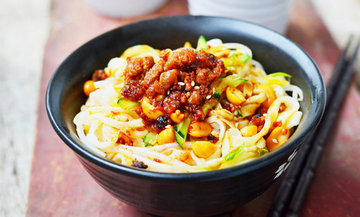 12、最后面条配上牛肉酱、黄瓜丝、绿豆芽、芝麻酱即可。
