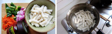 2、小锅烧清水,水开后放切好的年糕条,待年糕条浮起后捞出备用。