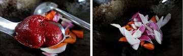 3、炒锅倒底油,放洋葱、胡萝卜炒香;加辣椒酱炒香。