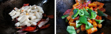 4、加适量清水翻炒,这时加焯好的年糕条,翻炒几下,放青椒片继续翻炒。最后出锅装盘即可。