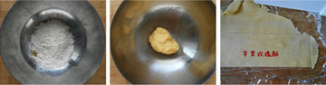2、黄油稍融化,加低粉揉成面团,擀成长形的很薄的皮,切平整。