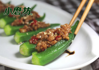 主料:猪绞肉60g,秋葵10支,辣椒碎5g