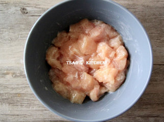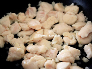 4 、热锅加一点油,中火放入蒜末炒香,再放入鸡肉炒至变白。