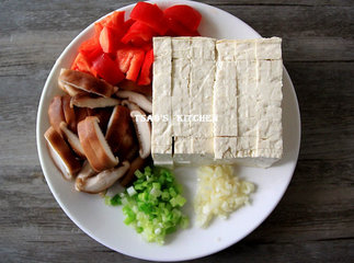 2 、腌料同时,将材料洗净切好。豆腐切丁、红甜椒切小块、香菇去蒂切厚片、蒜切末、葱切成葱花备用。