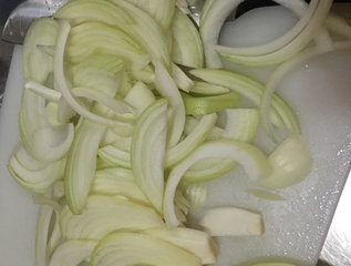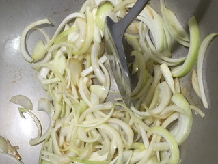 2 、油锅热后,将洋葱放入锅内炒到香气释出、呈金黄色。