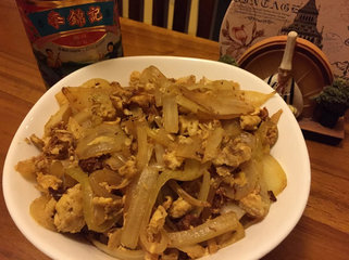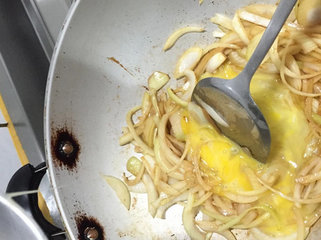 6 、这次因为一边炒菜一边煮面,所以洋葱和蛋炒得过久,下次在洋葱香味开始飘出后,就可以放蛋啦!