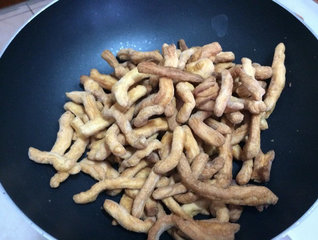 5 、锅中放入适量的炸油.炸成金黄色.捞起备用。
