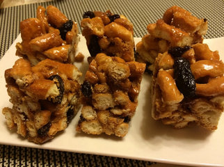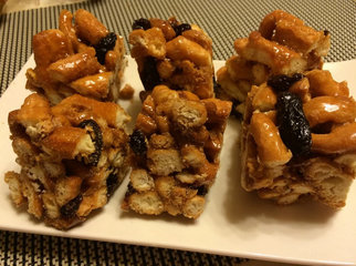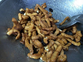 6 、炒菜锅中先放入水,再糖,麦芽糖,水,蜂蜜..开中火.滚后..关小火..煮到稠状..关火....放入炸好的面条跟葡萄干...迅速的拌匀。