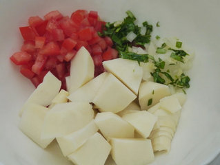 1、绿竹笋整支连皮刷洗干净,放入电锅蒸熟,等笋子放凉后剥除外壳,再切成滚刀块、蕃茄去籽后切成小丁、九层塔切碎备用。
