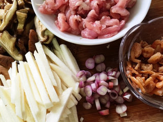 主料:绿竹笋1枝,猪肉丝150g,红葱头6瓣,干香菇6朵,虾米1小把,米1米杯
