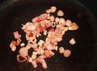2 、热锅加点油,先爆香红葱头,炒至有点焦黄。