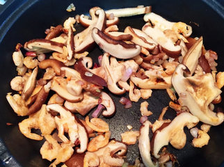 3 、加入香菇丝、虾米继续爆炒(这个步骤真的超香的)。