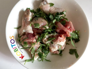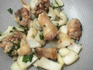 2 、鸡肉切块以橄榄油、香草、白酒少许腌渍10分钟。