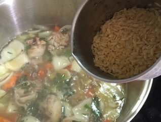 4 、汤锅加水加入切块红萝卜、马铃薯、义大利米粒、鸡肉、洋葱煮8分钟;再加入舞菇、豆腐及青豆煮5分钟。