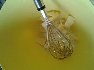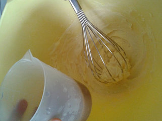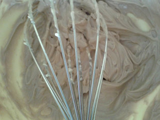 6 、把(5)少量多次地加入打发了的奶油里,一直不断地搅拌。(是会油水分离,但只要一直搅拌就行了)
