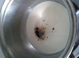 5 、鲜奶和咖啡粉放入锅子里开火,至咖啡融化在鲜奶。(要弄热是把咖啡香味提出来)