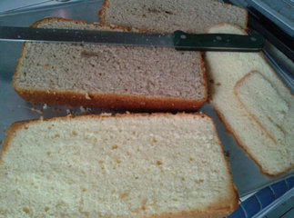 1、烘好的蛋糕,要取出待凉,过后放进冰箱。这样蛋糕才容易切,不会散散的。