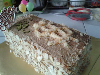 13 、做好后,放入冰箱一小时,过后才把蛋糕取出外面涂上剩下的奶油霜,沾上巧克力米,或随你的创意来装饰。