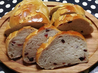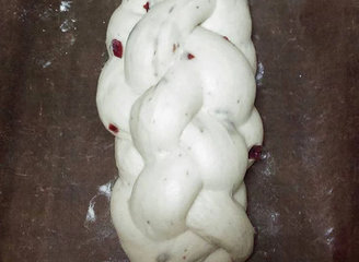 1、除奶油外,其余材料放面包机顺序水-糖-草莓酱-盐-面粉-酵母搅拌5分钟后置入奶油续搅15分,最后5分钟投酌量蔓越莓,面团放入钢盘(底稍抹油),面团入烤箱,放碗热水进行,一发40分。