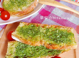 紫苏青酱香烤面包,紫苏富含矿物质和维生素,具有很好的抗炎作用,而且可为其他食品保鲜和杀菌,用紫苏做出来的青酱,香气十足,而且清爽可口,涂在面包上或是做成义大利面等都是美味满点喔。