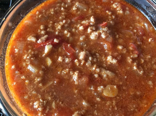 2、热锅,倒入一匙橄榄油,爆香蒜末,炒香洋葱,放蕃茄下去炒匀,倒猪绞肉进去炒至变色,陆续加入 酱料 中大火煮滚,转小火炖煮四十分钟即可。