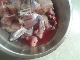 2、加盐,料酒腌制10分钟,加了盐所以田鸡还会出水。