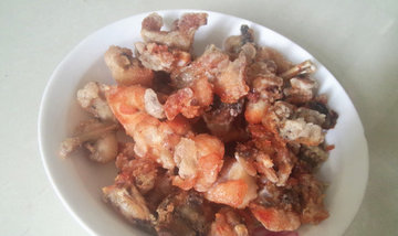 4、一面金黄后,翻面。田鸡炸好后,装起备用。