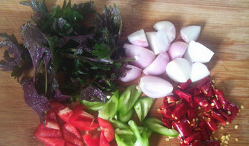 5、把辣椒,辣椒干,小洋葱,紫苏切小。