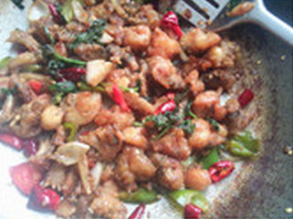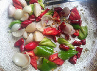 6、锅里留一点油,放入小洋葱,辣椒干煸香,倒入青红椒。