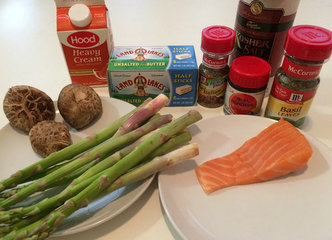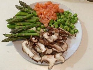 主料:鲑鱼小块,芦笋8支,香菇3朵